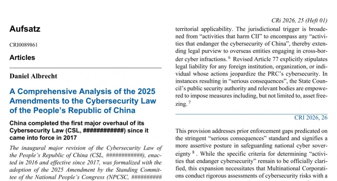 Die erste umfassende Überarbeitung des Gesetzes zur Cybersicherheit der Volksrepublik China (CSL, 中华人民共和国网络安全法) – ursprünglich 2016 verabschiedet und seit 2017 in Kraft – wurde am 28. Oktober 2025 durch die Verabschiedung der Novelle von 2025 durch den Ständigen Ausschuss des Nationalen Volkskongresses (NPCSC, 全国人民代表大会常务委员会) formalisiert und trat am 1. Januar 2026 in Kraft. Diese Novelle stellt eine signifikante Verschärfung des regulatorischen Rahmens dar: Sie erweitert die Durchsetzungsbefugnisse erheblich, kodifiziert strengere rechtliche Haftungspflichten für Unternehmen und...