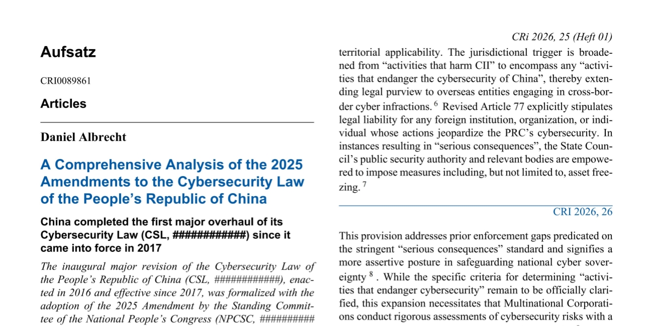 The inaugural major revision of the Cybersecurity Law of the People’s Republic of China (CSL, 中华人民共和国网络安全法), enacted in 2016 and effective since 2017, was formalized with the adoption of the 2025 Amendment by the Standing Committee of the National People’s Congress (NPCSC, 全国人民代表大会常务委员会) on October 28, 2025, entering into force on January 1, 2026. This Amendment represents a significant intensification of the regulatory framework, substantially enhancing enforcement powers, codifying stricter legal liabilities for enterprises and responsible personnel, delineating the gradations of regulatory violations, and imposing more rigorous compliance mandates on operators of Critical Information Infrastructure (CII, 关键信息基础设施). The revisions underscore the government’s strategic objective to foster the development of the artificial intelligence (AI) sector while concurrently fortifying national cybersecurity postures.